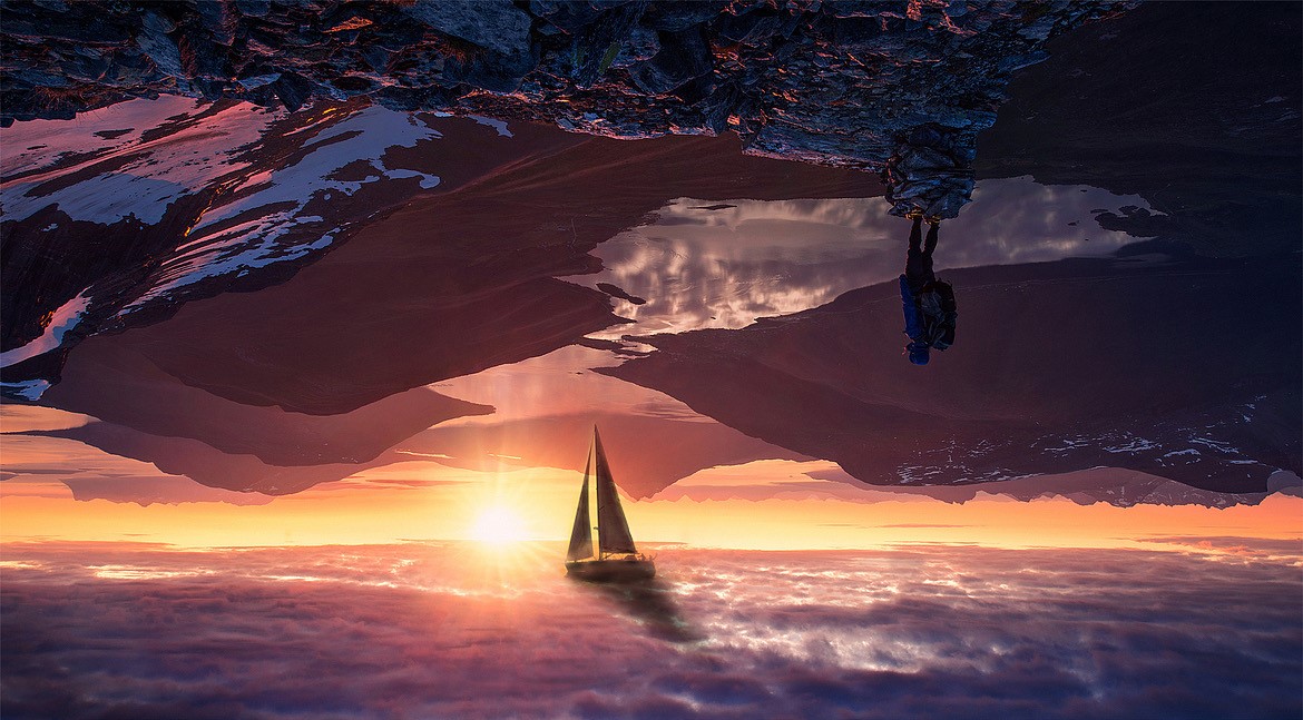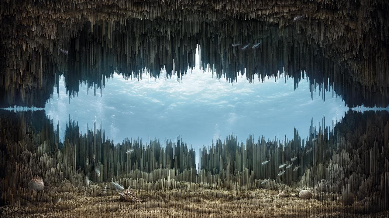 上下镜像寓意了虚拟世界是对现实世界镜像与修复。⾳轨镂空处仿佛⼀扇进⼊新世界传送⻔——朝霞,蓝天,海洋…