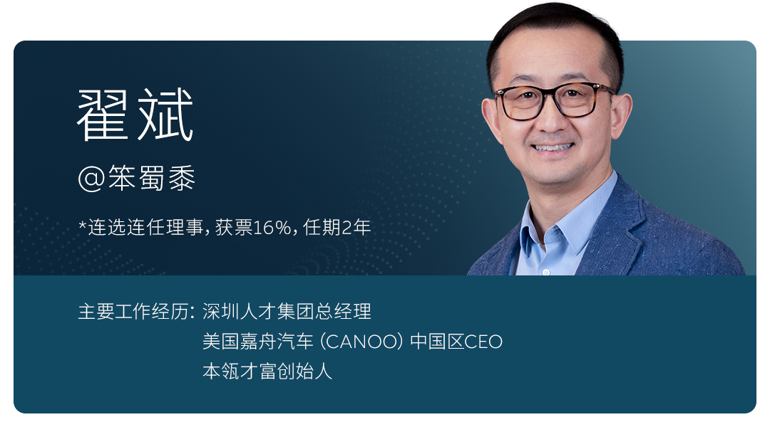 最终票数排名前4的候选人成为新任用户理事(任期2年),他们将与4名上届按期留任的理事(剩余任期1年)以及信托保护人李斌先生共同组成新一届用户信托理事会。让我们一起来认识一下第四届蔚来用户信托理事会成员: