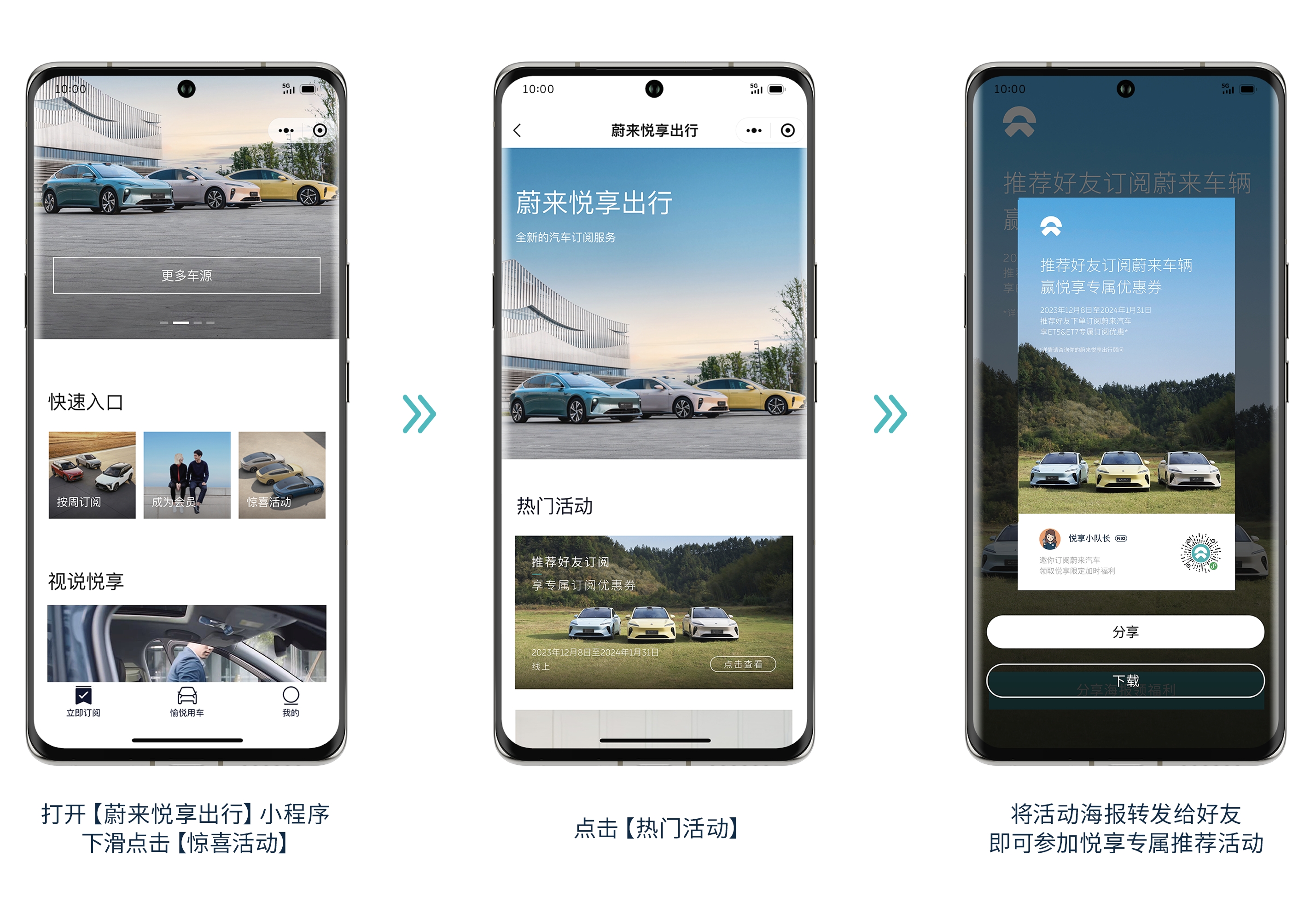 2023年12月8日-2024年1月31日期间,在微信搜索【蔚来悦享出行】小程序,下滑点击“惊喜活动-热门活动”,将相应的活动海报转发给好友,即可参加悦享专属推荐活动。