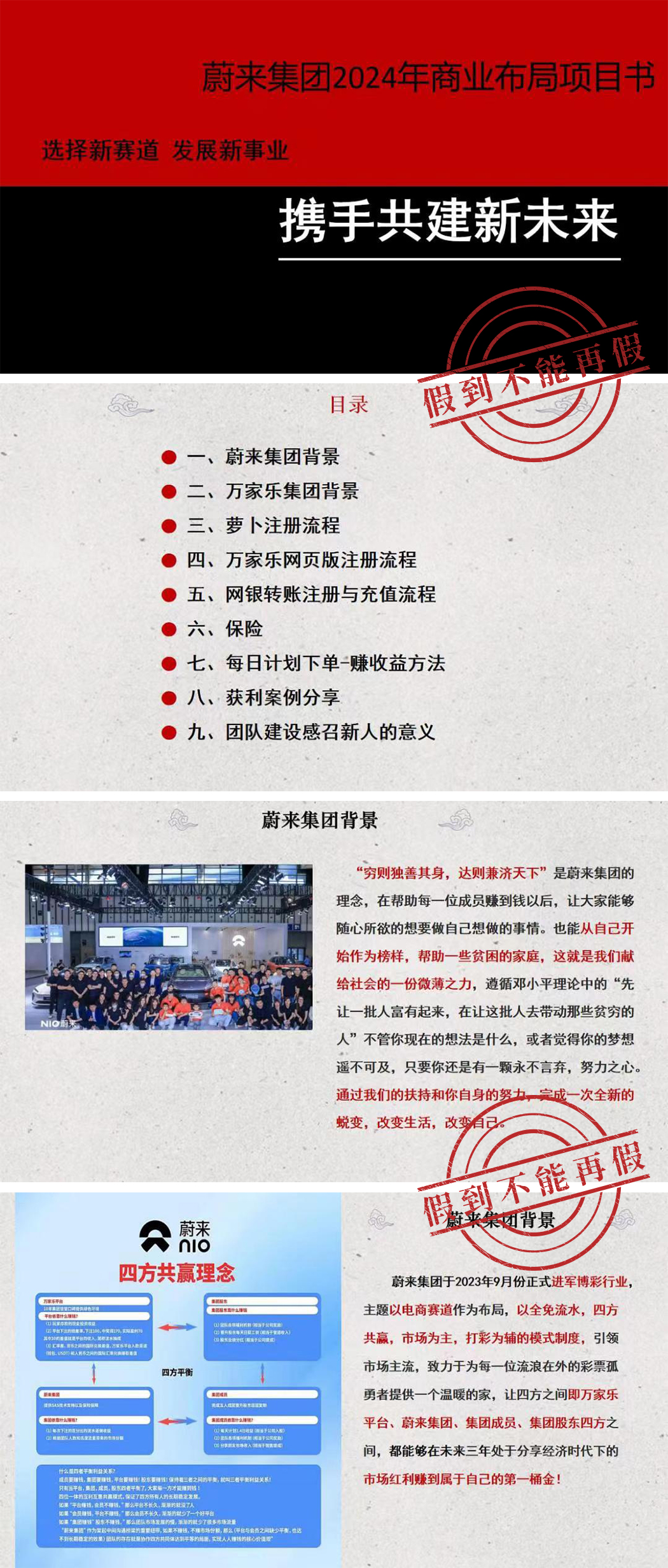 小喇叭今天听一些朋友说,有人通过微信到处转发《蔚来集团2024年商业布局项目书》。同时,有一个人号称“蔚来集团彩票分部创始人水木清华”,到处传播所谓的《蔚来集团2023年度大会总结》。这些文件称“蔚来进军博彩行业”,现在出资加入他们的公司,就能实现“日进斗金”。