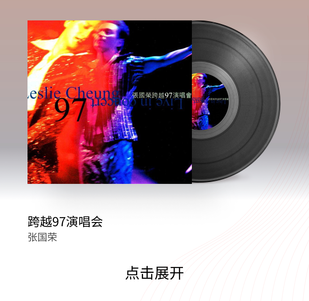 不管是作为哥哥复出后的舞台首秀,又或是作为一张现场录音专辑,《跨越97演唱会》的地位都是其他演唱会专辑难以望其项背的,豆瓣上的评分甚至来到了9.8分。这绝对是一张只听声音就能联想到画面的专辑,观众的欢呼声、掌声以及哥哥和嘉宾的对白都在专辑中进行了保留,似乎从歌声里也能窥见他的一颦一笑。而无缝的编排也为专辑增添了更多沉浸感,让人颇感哥哥音容犹在。