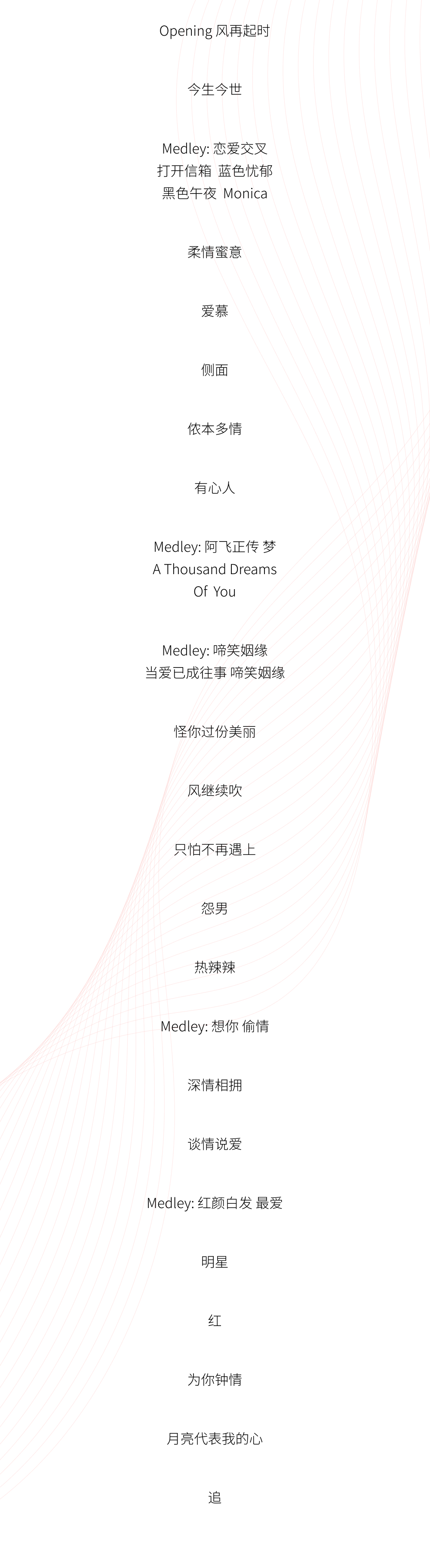 专辑里上下半场一共24首曲目,再算上串烧的Medley曲目,整张专辑算下来其实收录了多达39首歌曲。从《风再起时》到《风继续吹》,如果说上半场是哥哥对早期歌唱生涯的回顾,那么下半场才是全场气氛的高潮。哥哥在下半场大唱《怨男》、《偷情》这样性感暧昧的歌曲,在《红》中更是不顾时代眼光,打破性别刻板印象的桎梏,踏着一双艳丽红色高跟鞋、穿上黑色网袜,演绎了“雌雄同体”的绝代风华。