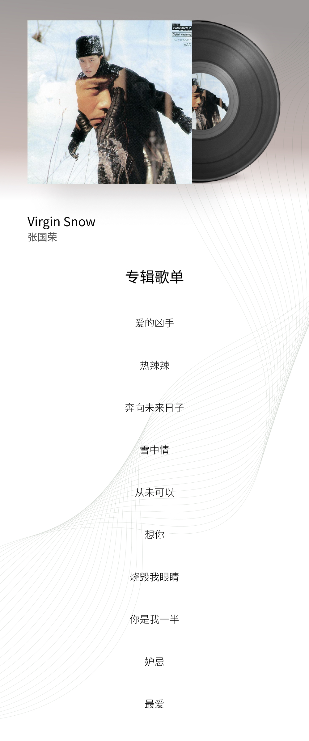 去年我们为大家上新了张国荣加盟新艺宝的首张唱片《Summer Romance 87'》,这张专辑的转型无疑是成功的,让哥哥彻底摆脱了70年代港乐的市井气息。于是次年哥哥又趁热打铁,推出了这张《Virgin Snow》。这张专辑依然是在日本录制完成的,哥哥也远赴加拿大拍摄了一系列雪景照片,可以说在制作和包装上都称得上豪华。从夏天到冬天,张国荣的歌声依旧动容。