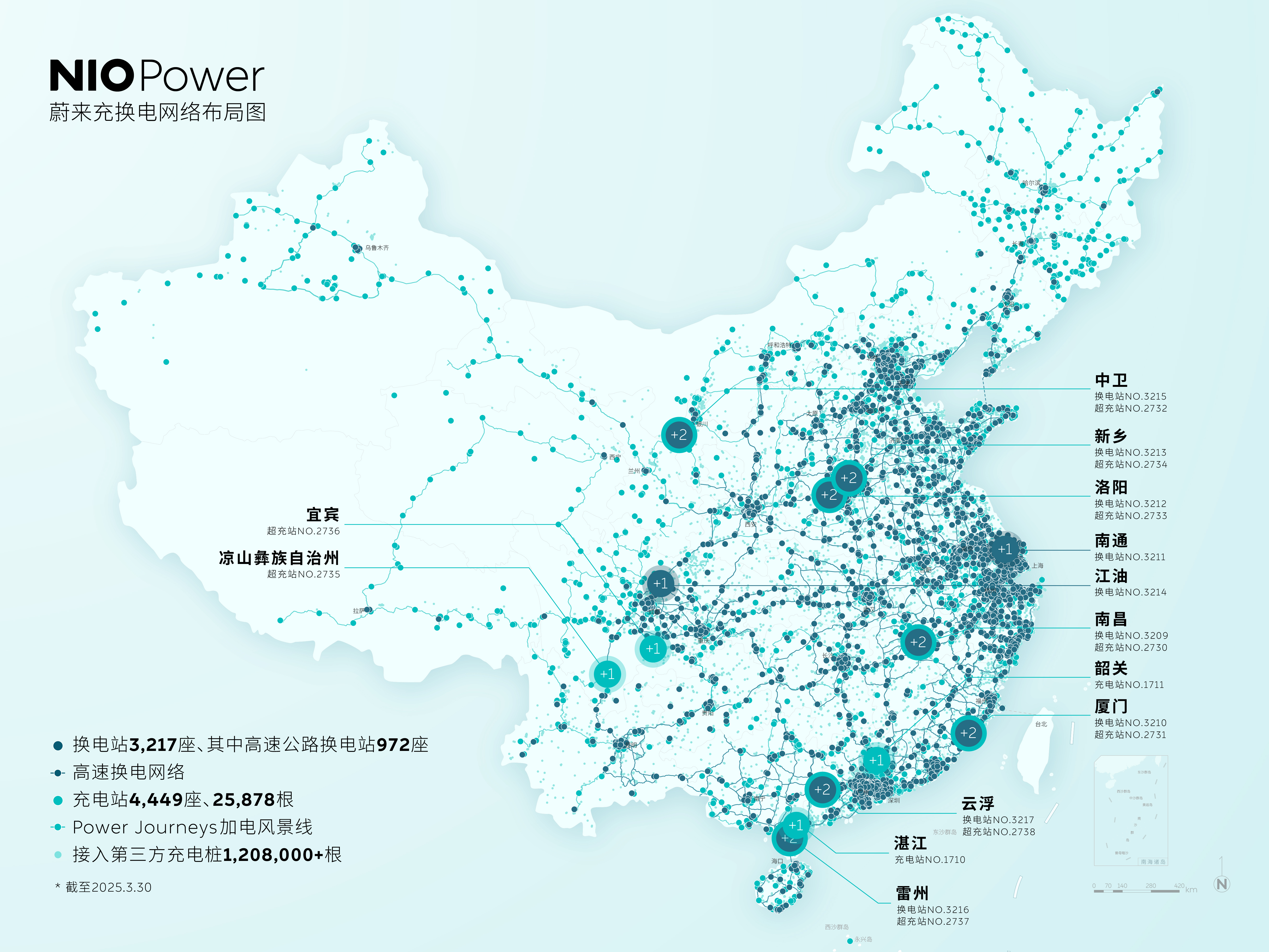 截至3月30日,蔚来已在全国布局换电站3,217座,其中高速公路换电站972座;充电站4,449座,包含25,878根充电桩;接入第三方充电桩1,208,000+根。