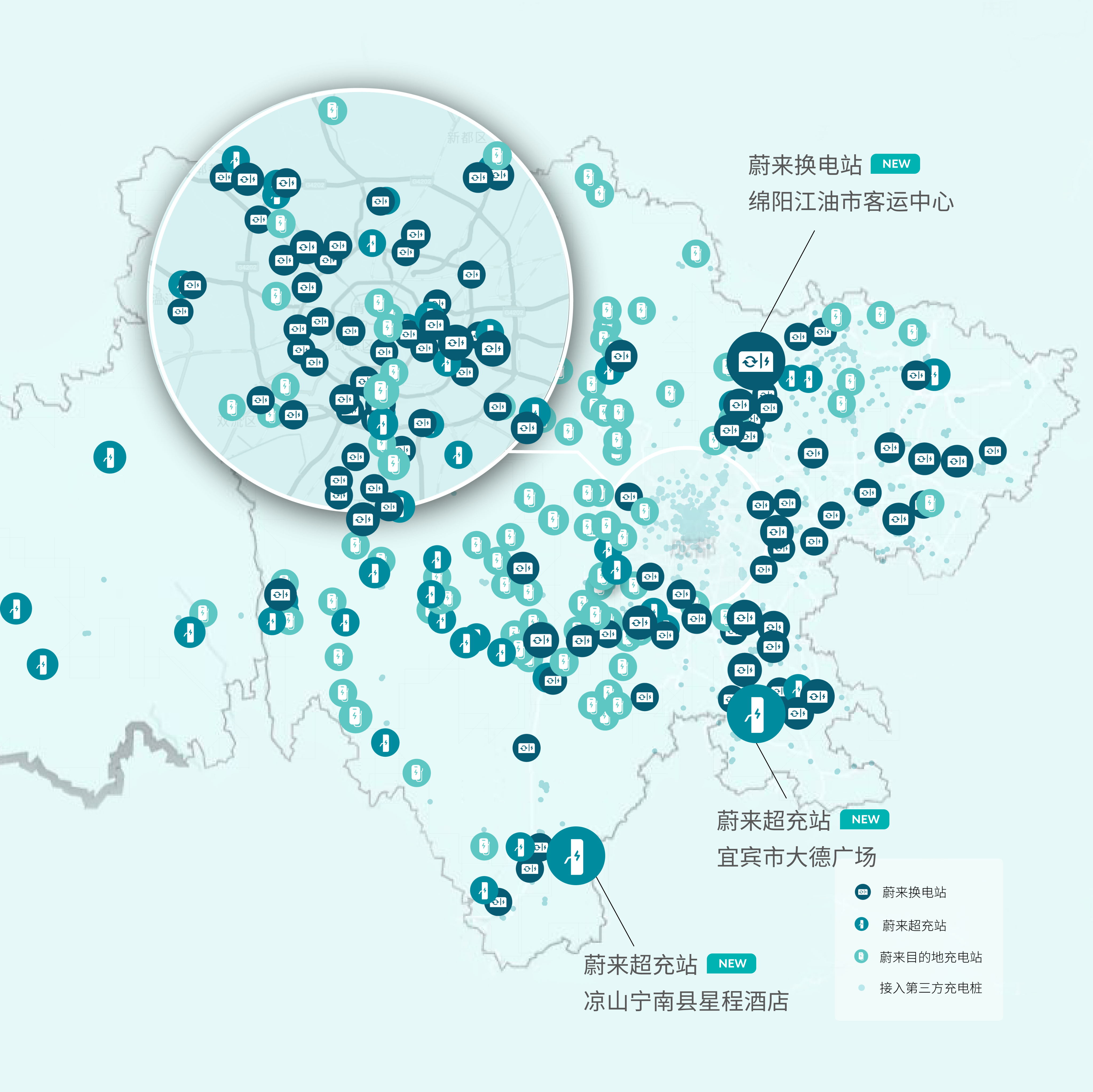 3月30日,绵阳市江油市新增1座换电站,凉山宁南县新增1座超充站,宜宾市大德广场新增1座超充站。蔚来川藏充换电布局持续加密,我们将持续为用户们带来高效便捷的补能体验。