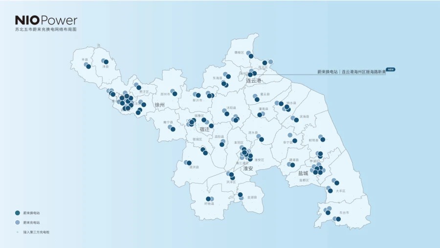 截至目前,徐州区域已上线蔚来换电站71座,60座充电站,222根充电桩。