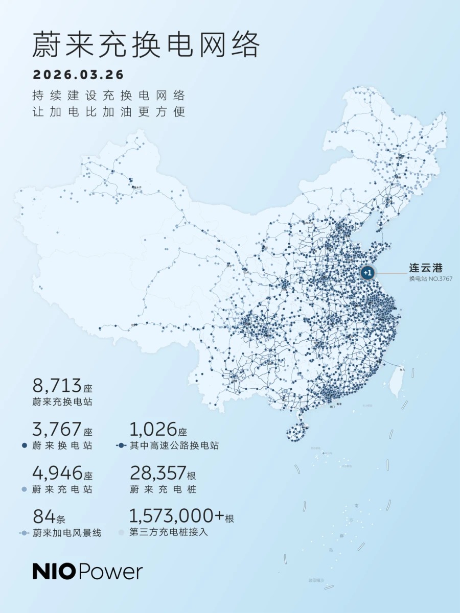 截至今日,蔚来已于全国布局换电站3,647座,其中高速公路换电站1008座;充电站4,848座、充电桩27,640根,接入第三方充电桩147余万根。