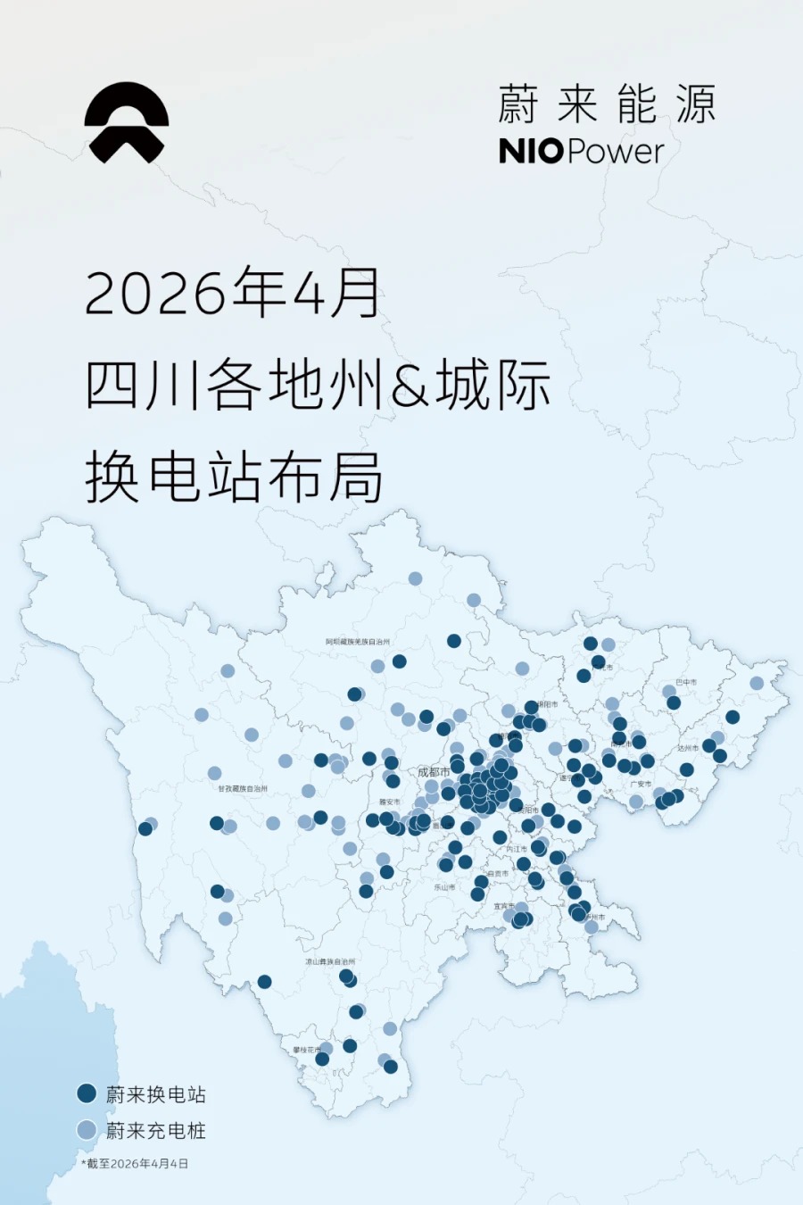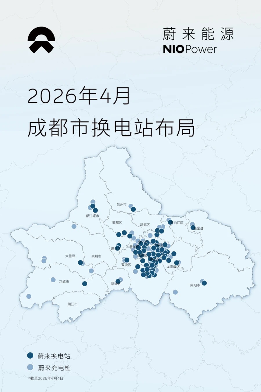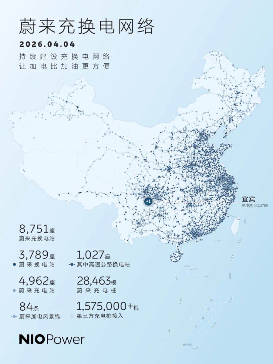 截至4月4日,蔚来已在全国布局换电站3,789座,其中高速公路换电站1,027座;充电站4,962座,包括28,463根充电桩;接入第三方充电桩1,575,000+根。
